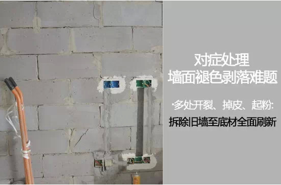 全面施工等于重新装修一样,工程量是最大的,适用于存在多处开裂、掉皮、起粉现象的墙面。首先墙面要全部铲除至水泥层,若是一些居住年代较久(如80年代以前)未装修的房子,更是需要铲除到砖墙体表面,然后全面施工翻新墙面:平整墙面——固化基层——刷界面剂——批刮三遍耐水腻子——墙面打磨——上一遍底漆——上两次效果面漆。